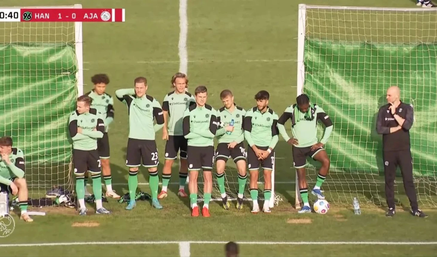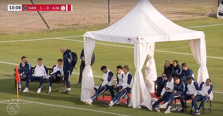 На 10-й минуте Антон Гоэи получил по ногам в немецкой штрафной. В момент остановки игры камера трансляции выхватила скамейку запасных «Аякса». Большинство футболистов не следили за ходом встречи – парни увлеченно сидели в телефонах. Оператор сразу же перевел камеру на скамейку «Ганновера», где все игроки стояли у кромки поля и неравнодушно наблюдали за происходящим.