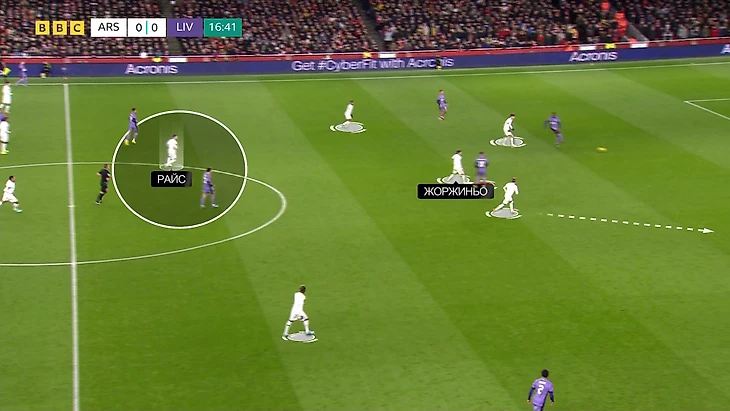 Из-за скоростных качеств Райса в такой динамике был смысл. Аналогичным образом эта пара действовал и при контрпрессинге. Вместе с хорошей первой волной от Хавертца и Эдегора это привело к качественному давлению без дыр. Все смещались по мячу и быстро перекрывали ближние варианты.