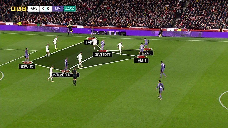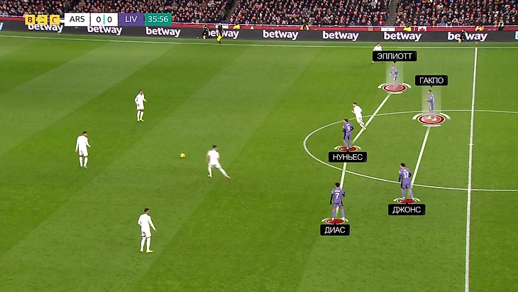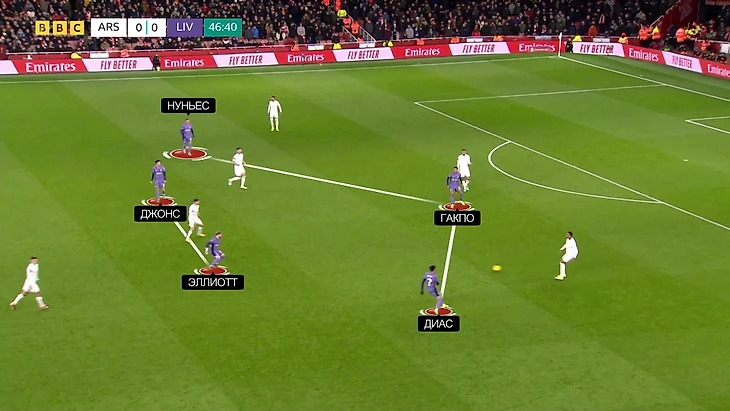 Изначально «Ливерпуль» использовал Харви Эллиотта на позиции Салаха. В плане игрового профиля у Харви есть сходства с Мо. Пожалуй, наибольшие среди всех претендентов на позицию. Вероятно, таким образом хотели сохранить привычную динамику. Стартовое расположение было таким – тройка Эллиотт, Нуньес, Диас, а Гакпо среди полузащитников: