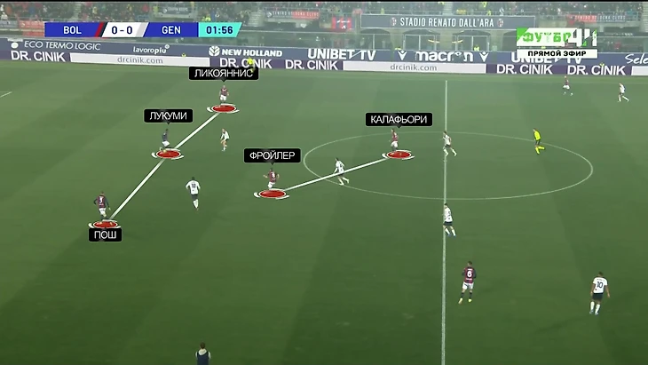 За трансформацию из центрдефа в опорника отвечал Риккардо Калафьори – при владении он поднимался в центр поля, а команда образовывала структуру 3+2: