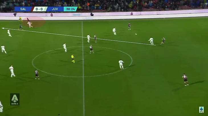 «Салернитана» забила почти идентичный мяч: использовала вертикаль в эпизоде, который по всем механизмам прикрывается латералем, а не центрбеком – то есть на него должен реагировать Костич. Серб опоздал, аутсайдер повел в счете (в итоге проиграл 1:2).