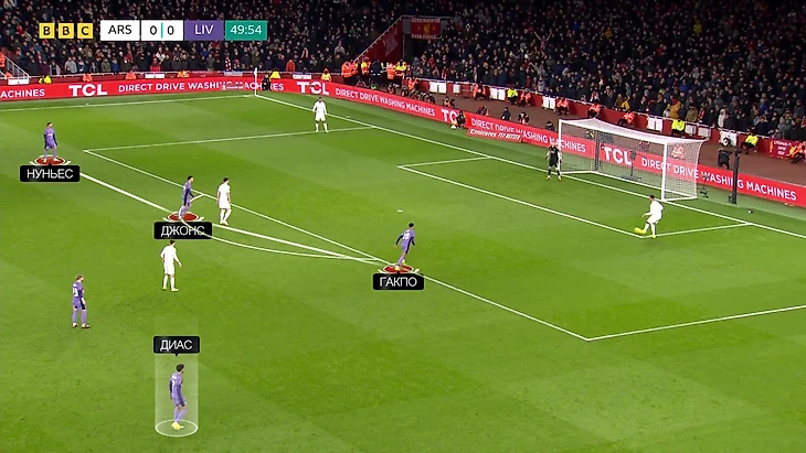 2. Преобразование собственного прессинга. Во втором тайме «Ливерпуль» начинал давление с тройкой Нуньес, Джонс, Гакпо (Жота), а Диас располагался поглубже. Это сочетание обеспечивало максимальную интенсивность давления:
