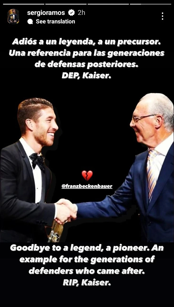 Серхио Рамос: «Прощай, легенда, первопроходец. Пример для последующих поколений защитников. Покойся с миром, Кайзер».