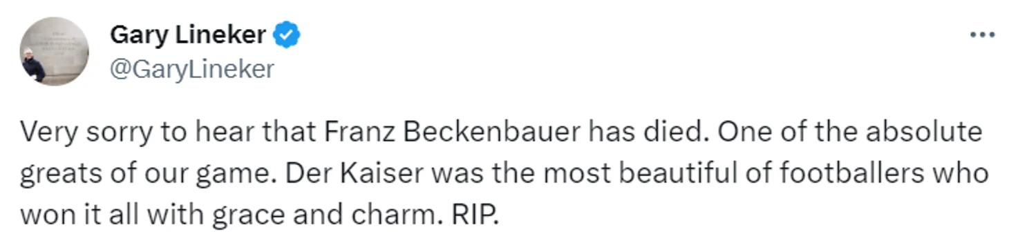 Гари Линекер: «Очень жаль слышать, что Франц Беккенбауэр скончался. Один из величайших представителей нашей игры. Кайзер был самым прекрасным футболистом среди тех, кто выиграл все – с грацией и очарованием».
