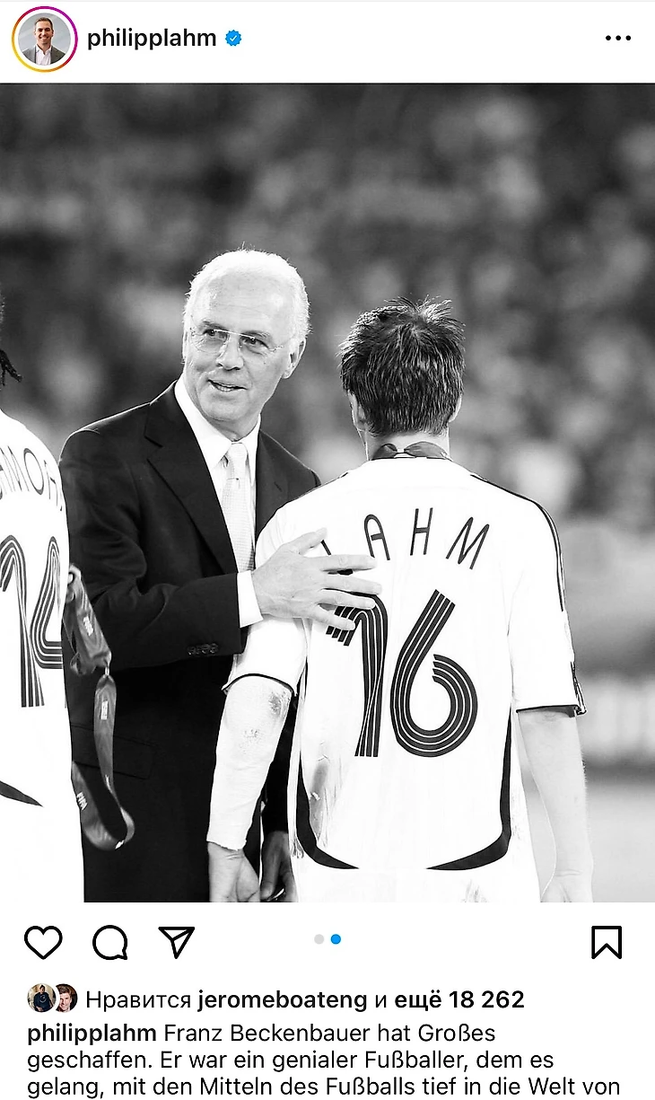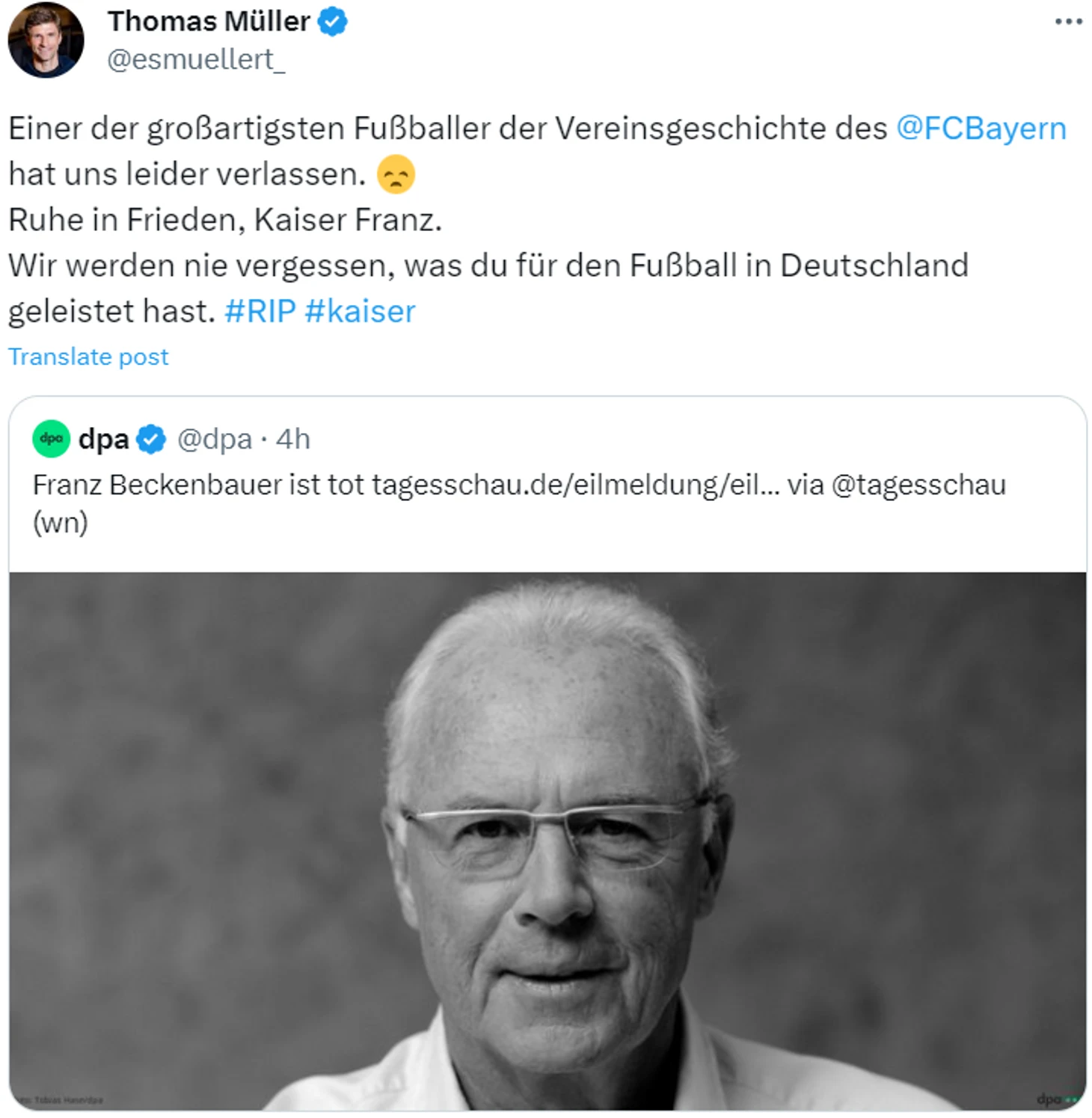 Томас Мюллер: «Один из величайших футболистов в истории «Баварии», к сожалению, покинул нас. Покойся с миром, Кайзер Франц. Мы никогда не забудем, что ты сделал для футбола в Германии».
