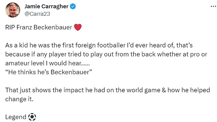 Джейми Каррагер: «Покойся с миром, Франц Беккенбауэр. В детстве он был первым иностранным футболистом, о котором я услышал. Ведь если какой-нибудь игрок попытался бы сыграть в обороне, будь то на профессиональном или любительском уровне, я бы услышал: «Он думает, что он Беккенбауэр». Это показывает, какое влияние он оказал на мировой футбол и как он помог изменить эту игру. Легенда».