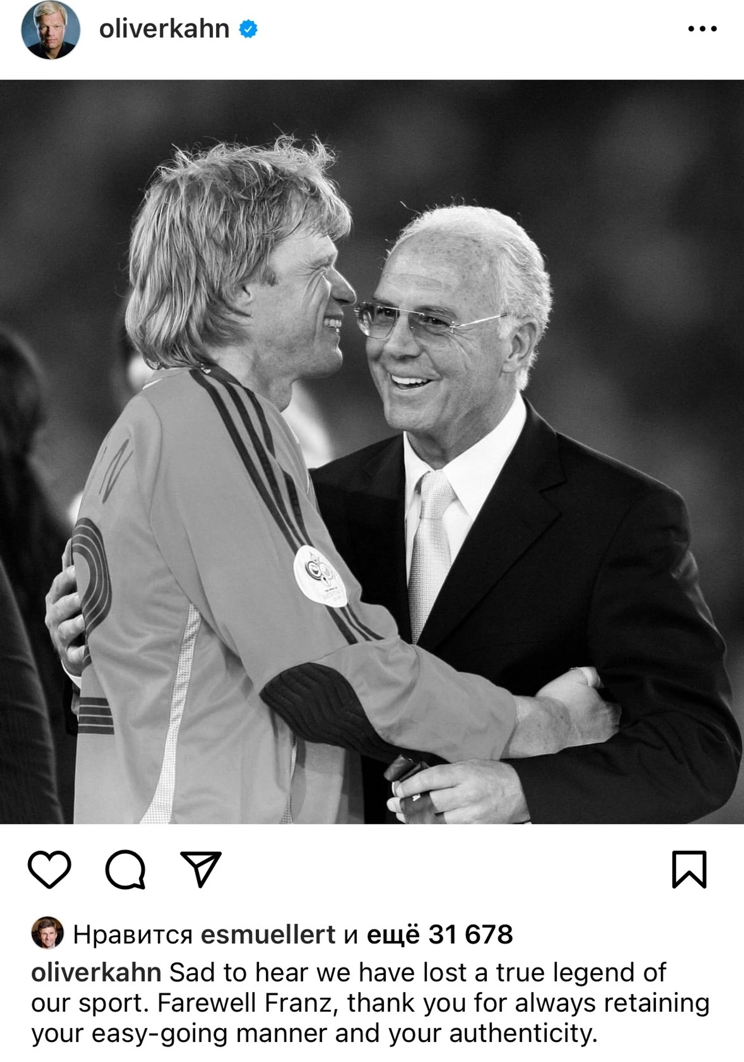 Оливер Кан: «Грустно слышать, что мы потеряли настоящую легенду нашего спорта. Прощай, Франц, спасибо тебе за то, что ты всегда сохранял свою непринужденность и аутентичность».