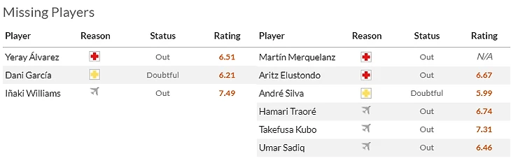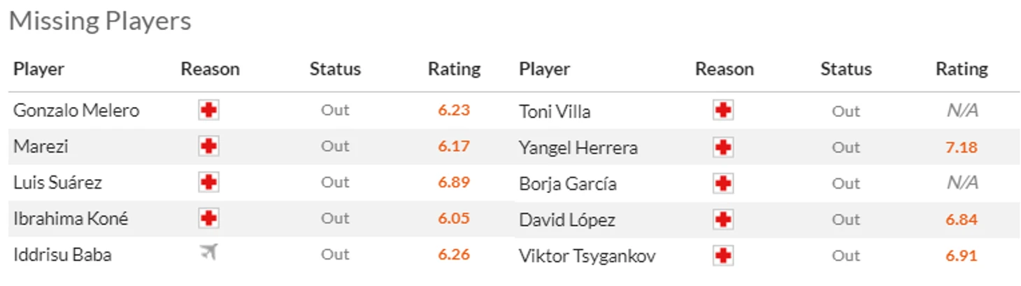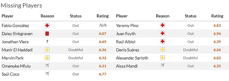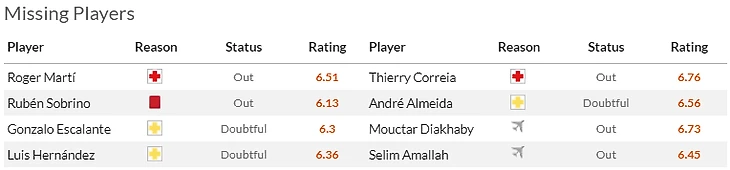 Кроме того по травме пропускает выезд в Альмерию Эрик Гарсия(5,5), зато в общую группу вернулись Виктор Цыганков(7) и Янхель Эррера(6).