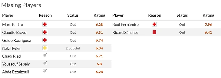 Ситуация то у андалусийцев непростая: кроме потерь от Кубка Африки, защита хозяев недосчитается травмированного Миранду(5,5), а полузащита - Карвальо(6,5) Также под вопросом участие в субботней игре приболевших Альтимиры(5,5) и Бельерина(6).