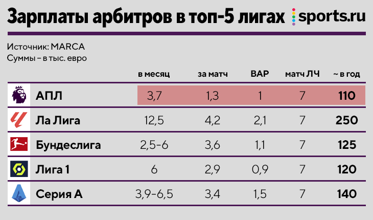 2. Английским судьям мало платят. В апреле 2023-го MARCA сравнила зарплаты арбитров в топ-5 лигах Европы. Арбитры самой богатой лиги мира получают меньше всех.