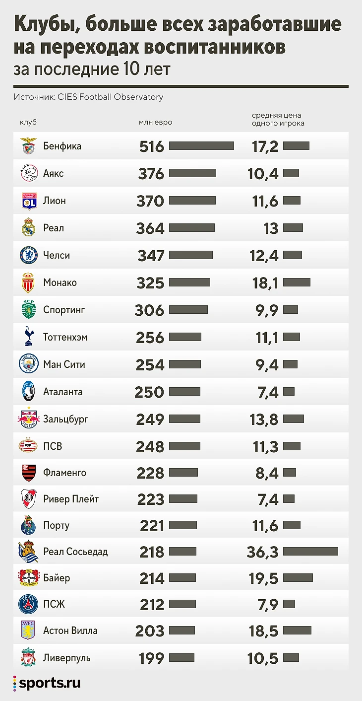 Рейтинг 100 самых прибыльных футбольных академий мира – итог новой работы Международного центра спортивных исследований (CIES Football Observatory). Там учтены доходы от трансферов за игроков, которые провели в академиях не менее трех сезонов в возрасте от 15 до 21 года.