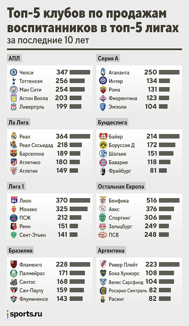 ● 30 и более воспитанников за эти десять лет продали восемь клубов. Лидер – «Аякс», 36 игроков. На одного меньше у «Интера» и «Ромы», на два – у «Аталанты». У «Лиона» 32 продажи, у «Спортинга» – 31, а у «Бенфики» и «Ривер Плейта» – по 30.