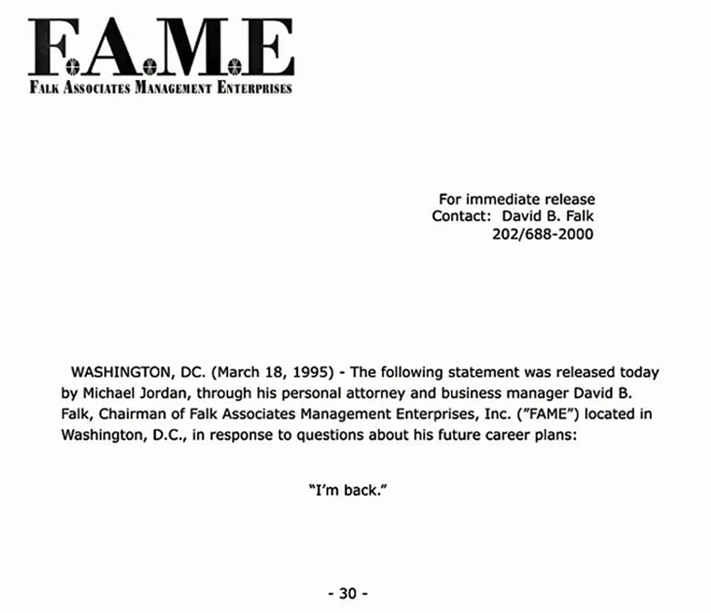 Терминатор говорил в будущем времени, а Джордан утверждал в прошедшем, как о факте: «Я вернулся». Известно, что агент собирался написать от имени великого баскетболиста что-то развернутое, пояснить детали, но Майкл сформулировал все сам.