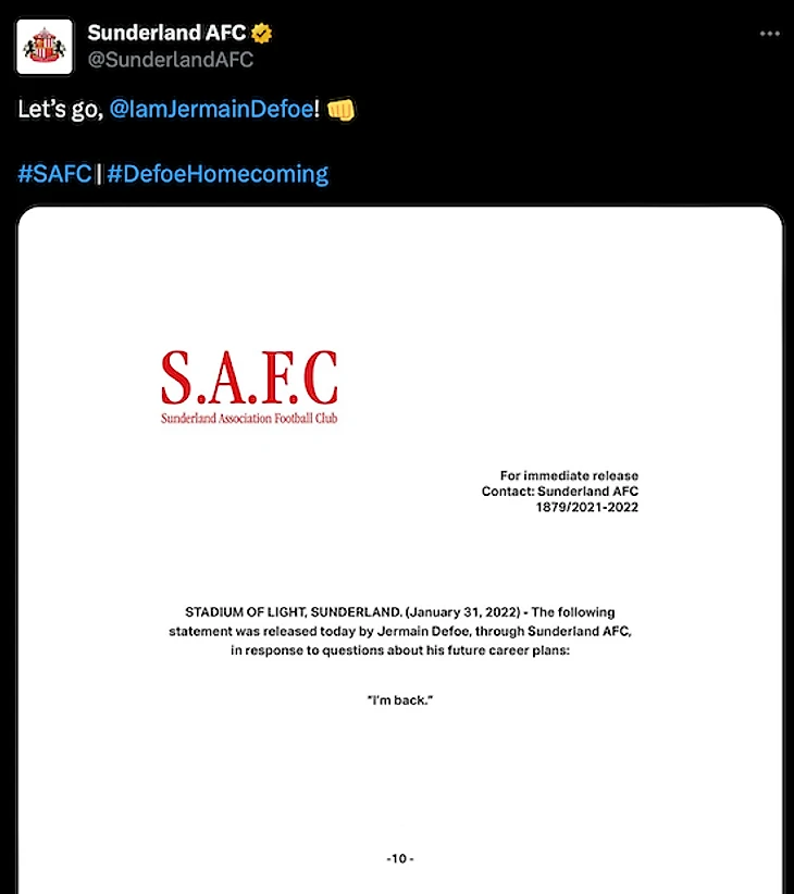 Метод Джордана уже использовали в футболе. Так Дефо воссоединился с «Сандерлендом»