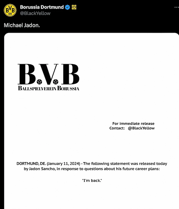 Дортмундцы перед объявлением о трансфере коротко написали в соцсетях: «Следующее заявление опубликовано сегодня Джейдоном Санчо в ответ на вопросы о его планах на будущее: