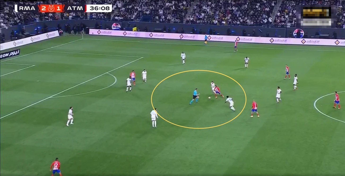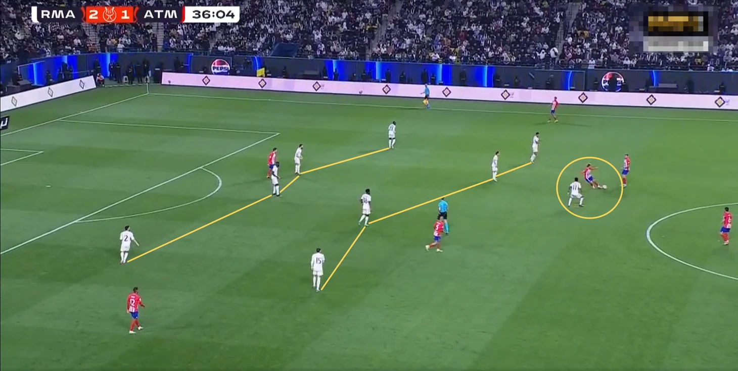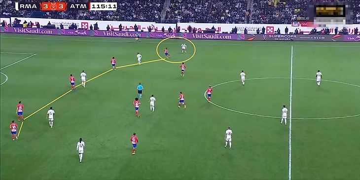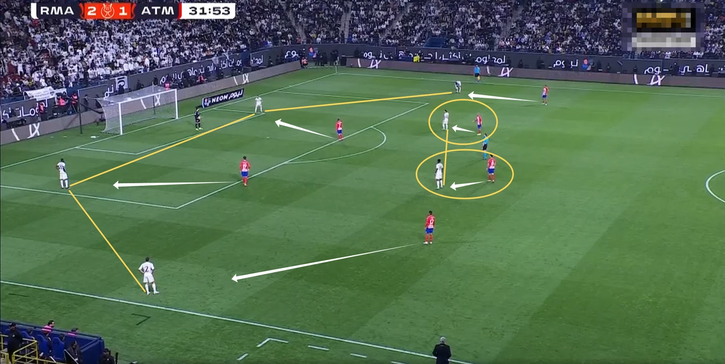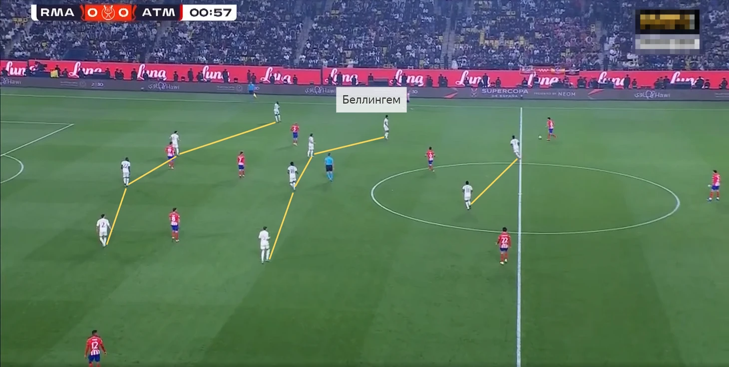 В начальной фазе атаки команда Анчелотти располагалась по схеме 4+2 с Модричем и Тчуамени в опорной зоне. «Атлетико» встречал пятёркой футболистов, из-за чего часто «Мадрид» выходил из-под давления за счёт свободного игрока.