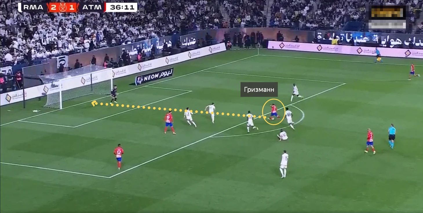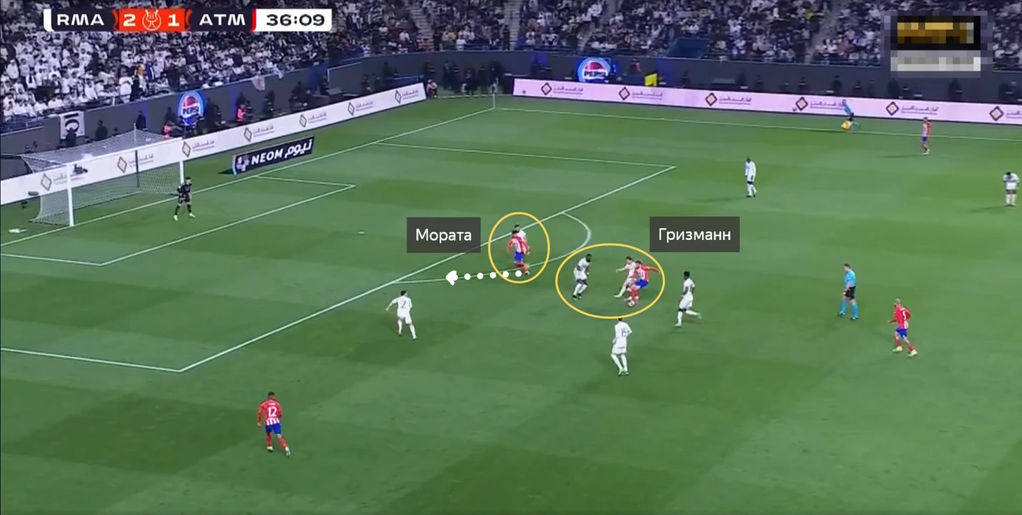 Дальше за счёт взаимодействия с Де Полем вытянул Тчуамени и воспользовался свободным пространством за его спиной. Потом Мората увёл Начо, тем самым образовав свободное пространство куда умным движением и ушёл Гризманн, получив возможность нанести удар.