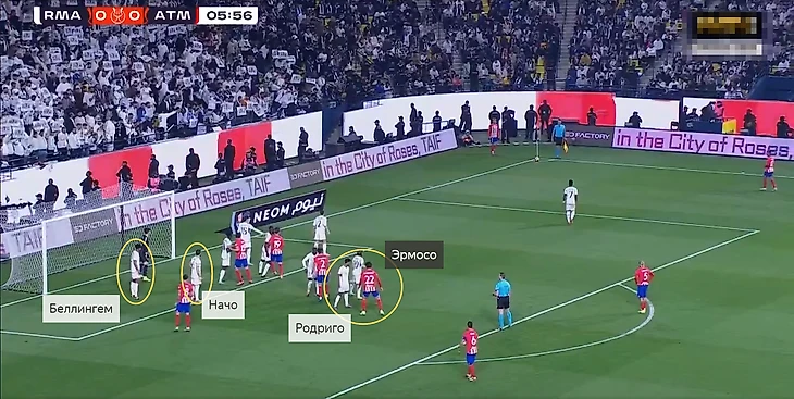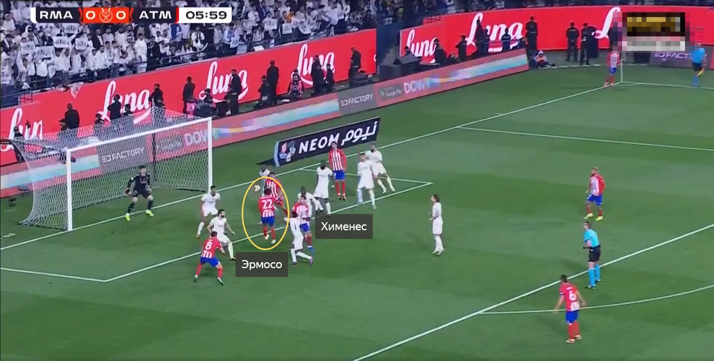 Эпизод с голом Эрмосо после углового пришёл из достаточно странной ситуации. «Мадрид» использовал зонно-персональный тип обороны на стандарте: игроков «Атлетико» в штрафной разбирали персонально, плюс несколько футболистов контролировали определённые зоны.