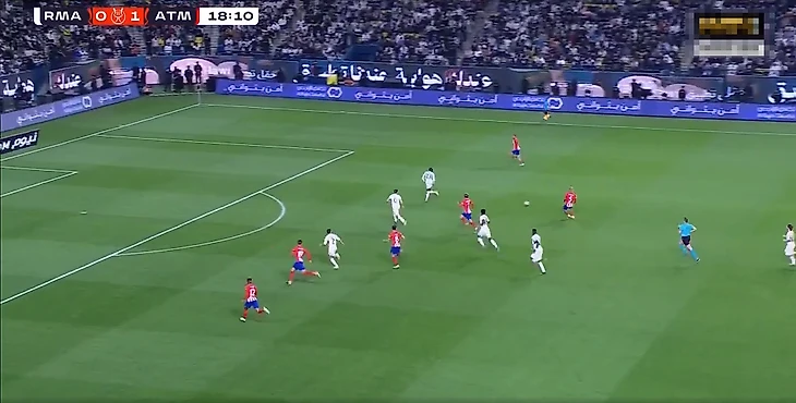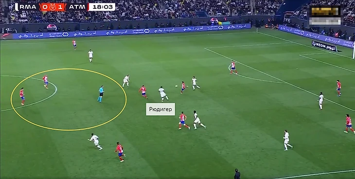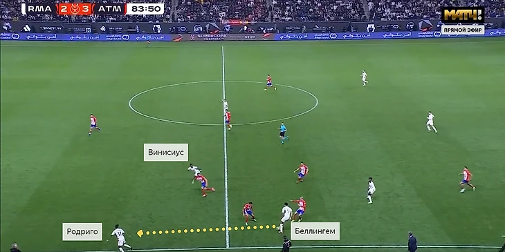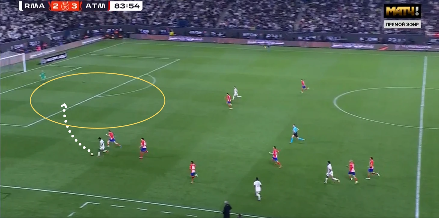 Гол пришёл после контратаки. Сначала на фланге образовалось много свободного пространства, что очень удобно для скоростных Винисиуса и Родриго. Потом футболисты «Атлетико» сильно вжались во вратарскую, из-за чего абсолютно свободной осталась зона подбора. В общем, после нескольких попыток команда Анчелотти всё-таки завершила эпизод голом.