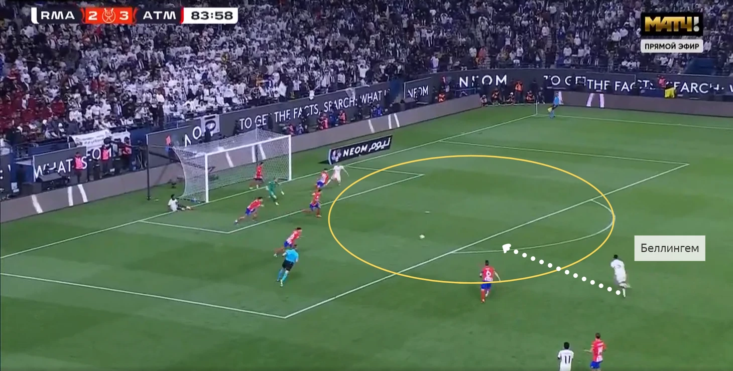 В осеннем матче «Мадрид» оставлял много свободы на флангах, а слева Кроос постоянно не успевал закрывать огромные дыры. В этом матче немец остался в запасе, а схема была более подходящей для ликвидации подобных вариантов. Без мяча команда Анчелотти действовала по схеме 4-4-2, где Беллингем опускался на левый фланг в линию из четырёх полузащитников.