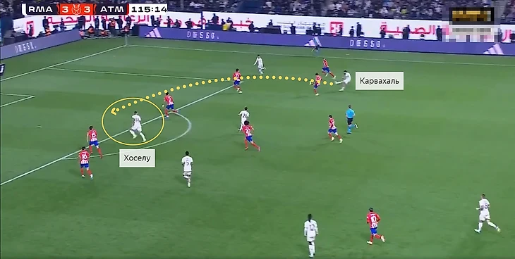Например, Хоселу сыграл важную роль в эпизоде с решающим голом (а Браим забил пятый). Мяч перевели на правый фланг, Аспиликуэта выдернулся на Карвахаля. «Атлетико» обороняется по схеме 5-3-2, поэтому сзади всё равно оставалась четвёрка, но между Савичем и Хименесом оставалось слишком много свободного пространства, которым воспользовался Хоселу.