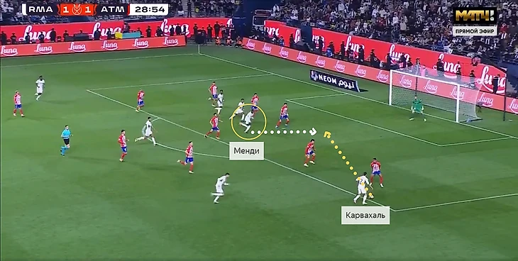 Во-вторых, из-за отсутствия классического центрального нападающего штрафную могут насыщать разные игроки, что зачастую даже опаснее из-за непредсказуемости и движения на рывке (а защитники в это время в статике). Здесь всё так и произошло: Карвахаль отдавал вбегающему Менди.