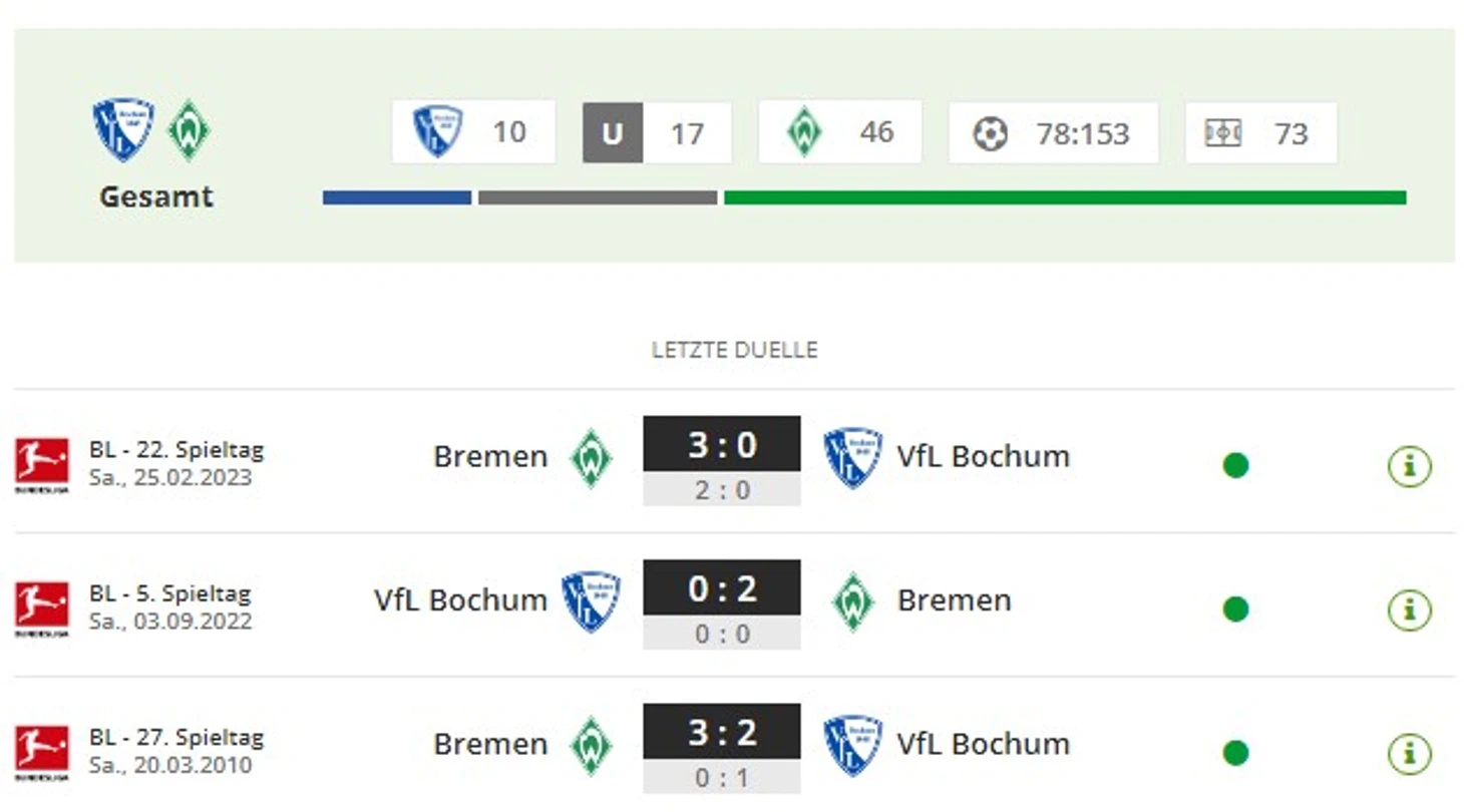 - «Вердер» не проигрывает в Бохуме на протяжении 11 матчей Бундеслиги (шесть побед, пять ничьих). Последний раз «музыканты» уступили там аж в сентябре 1998-го, под руководством Вольфганга Зидки (0:2).