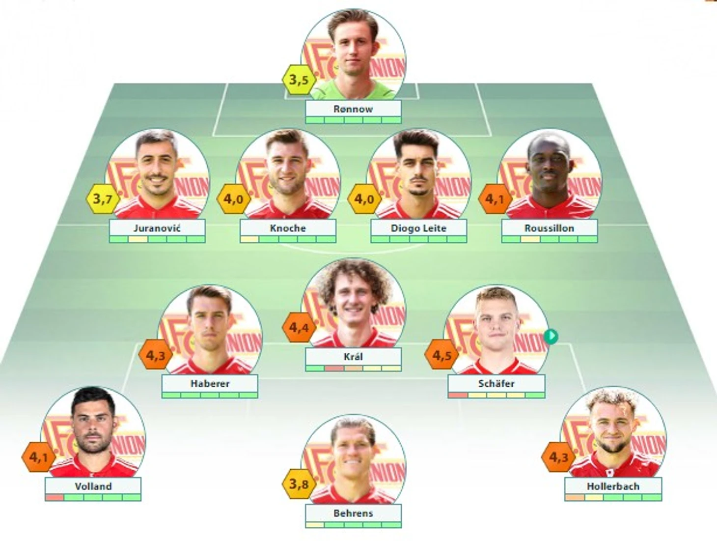 «Унион»: Реннов –Юранович, Кнохе, Лейте, Руссийон – Хаберер, Крал, Шафер – Хеллербах, Беренс, Фолланд