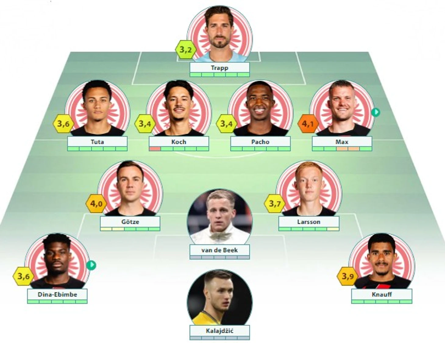 «Айнтрахт»: Трапп (c) – Тута, Кох, Пачо, Макс –Кнауфф, Гетце, Ларссон, Эбимбе – ван де Бек – Калайджич