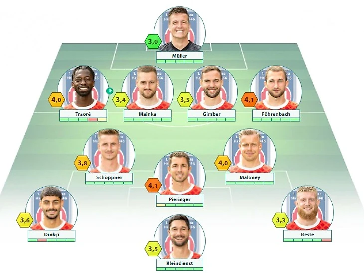«Хайденхайм»: Мюллер –Траоре, Майнка (c), Гимбер, Ференбах – Мэлоуни, Тойеркауф – Динкчи, Пирингер, Бесте – Кляйндинст