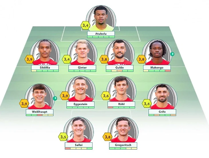 «Фрайбург»: Атуболу – Сильдийя, Гинтер, Гульде, Макенго – Шаллаи, Эггештайн, Рель, Грифо (c) – Хелер – Грегорич