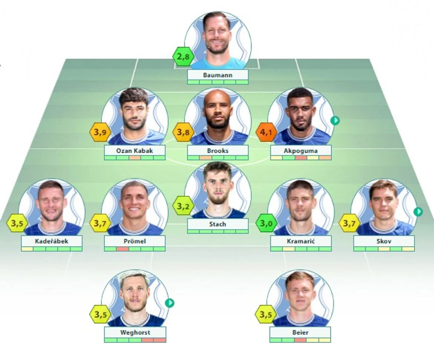 «Хоффенхайм»: Бауманн (c) – Кабак, Брукс Акпогума – Гриллич – Кадержабек, Премель, Штах, Сков –Вегорст, Крамарич