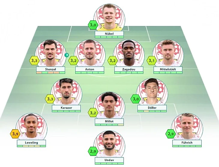 «Штутгарт»: Нюбель – Штенцель, Антон (c), Загаду, Миттельштедт – Каразор, Штиллер – Левелинг, Мийо, Фюрих – Ундав
