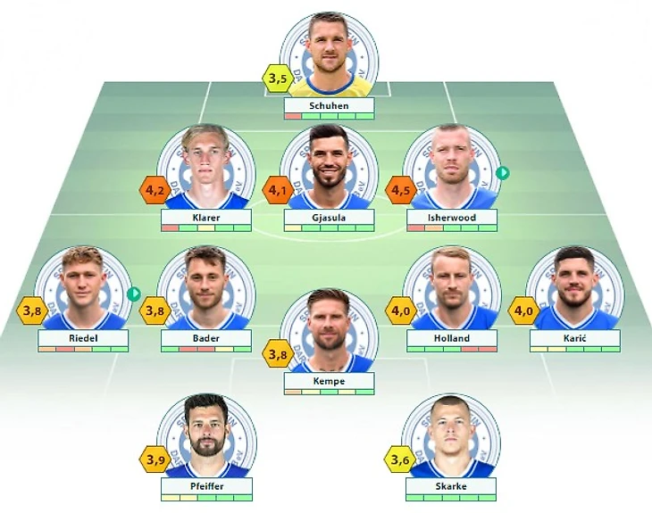 «Дармштадт»: Шуэн – Кларер, Гьясула, Ишервуд – Ридель, Франьич, Холланд (c), Карич – Кемпе –Пфайффер, Скарке