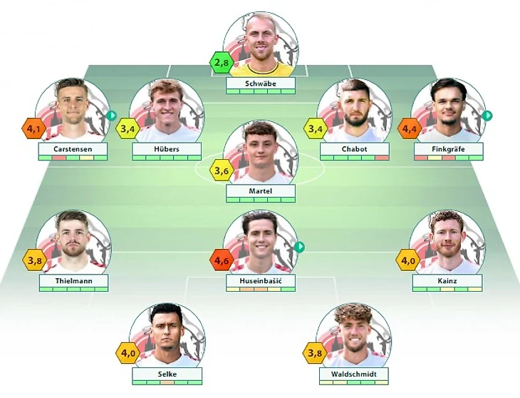 «Кельн»: Швэбе – Карстенсен, Хюберс, Шабо, Финкгрефе – Любичич, Мартель, Кайнц (c) – Вальдшмидт – Тильманн, Зельке