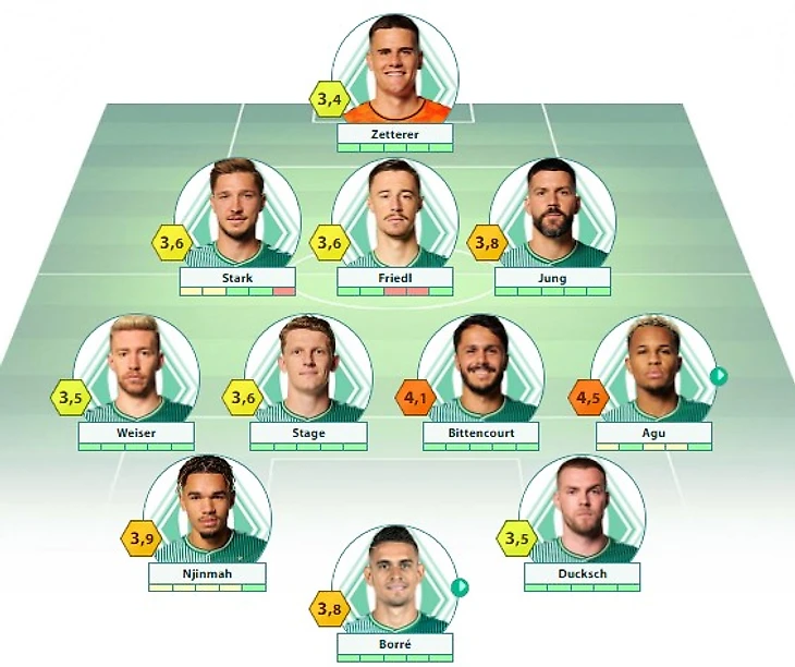 «Вердер»: Цеттерер – Старк, Фридль (c), Юнг – Вайзер, Шмид, Стаге, Биттенкурт, Деман – Нджинма, Дукш