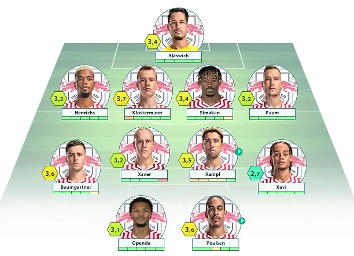 «РБ Лейпциг»: Бласвих – Хенрихс, Симакан, Кастелло, Раум – Баумгартнер, Шлагер, Кампль (c), Хави Симонс – Опенда, Поульсен