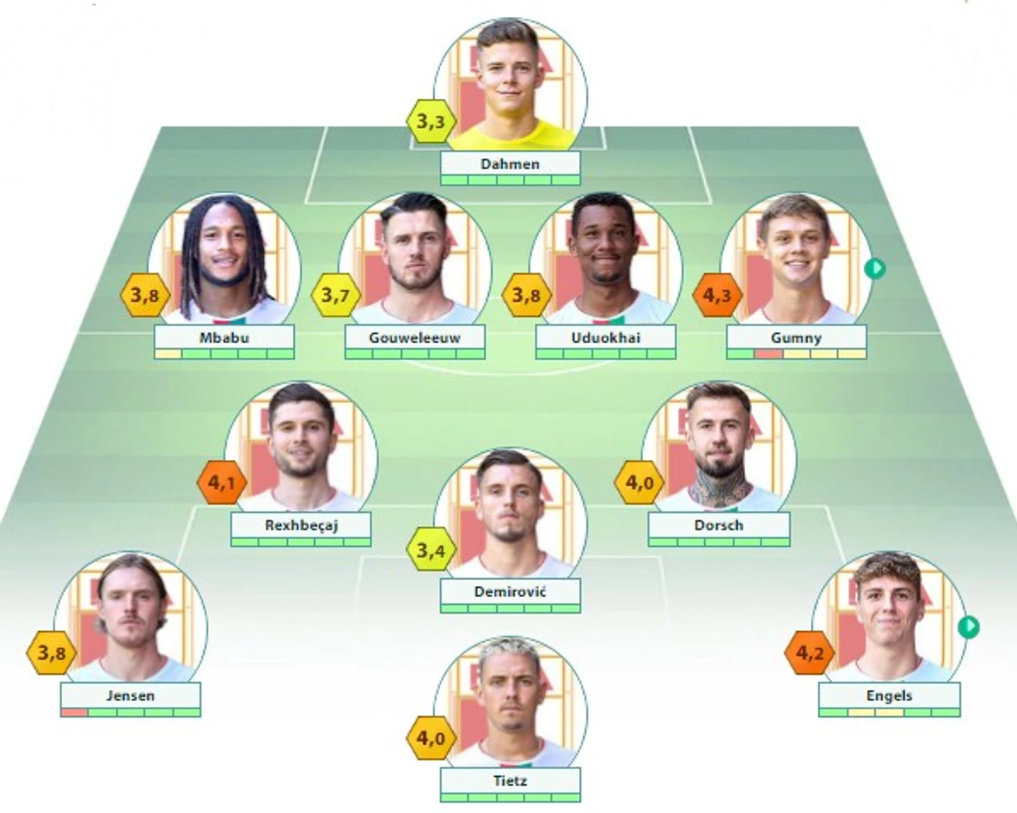 «Аугсбург»: Дамен – Мбабу, Гауэлеу, Удуохай, Гумны – Реджбечай, Дорш – Йенсен, Демирович (c), Энгельс – Титц