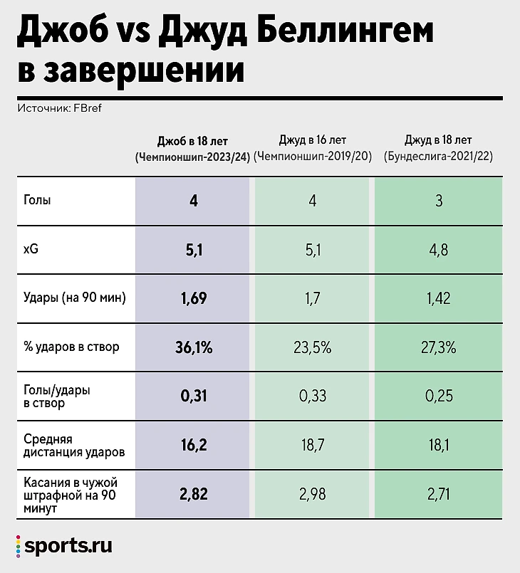 А вот на фоне Джуда до включения мегарежима Джоб смотрится уверенно. У него четыре гола в Чемпионшипе при xG 5,1. У Джуда были ровно такие же показатели в его первый взрослый сезон. Конверсия ударов в створ в голы тоже почти идентичная. Разве что Джоб бьет, как правило, с более близкого расстояния – из штрафной.