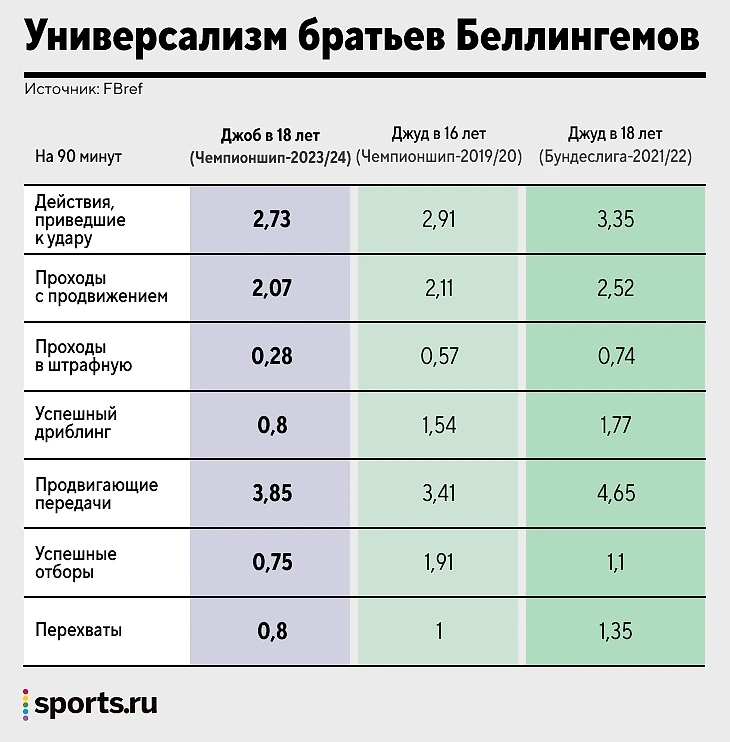 В общем, Джоб может похвастать разносторонностью. Но если сравнивать с Джудом, по большинству показателей младший все же несколько уступает королю универсализма. Берем за ориентиры два сезона Джуда – дебютный за «Бирмингем» (та же лига и этап развития братьев – до перехода в топ-чемпионат) и сезон 18-летия за «Дортмунд» (прямое сравнение по возрасту). Многие мадридские показатели – недостижимый космос, их трогать не будем.