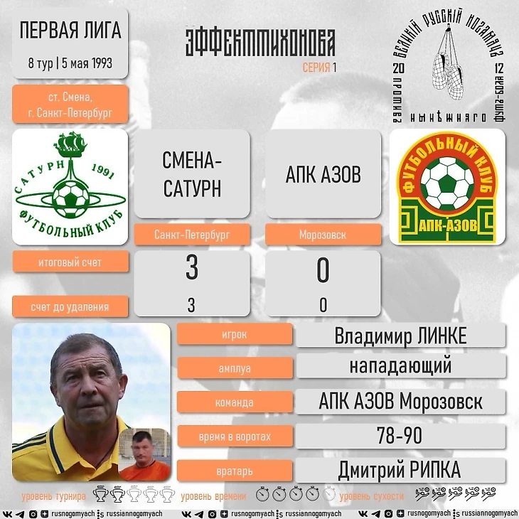 #ЭффектТихонова будем считать по трем парэаметрам - уровень турнира, время в воротах, пропущенные голы. У Владимира Линке такой вариант - первая лига +2, 12 минут в раме +4, ноль пропущенных +5. Итого 11 баллов.