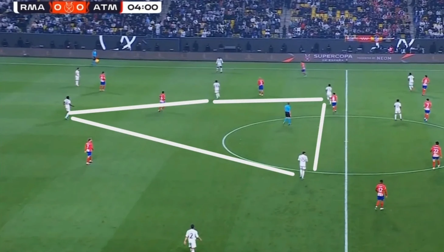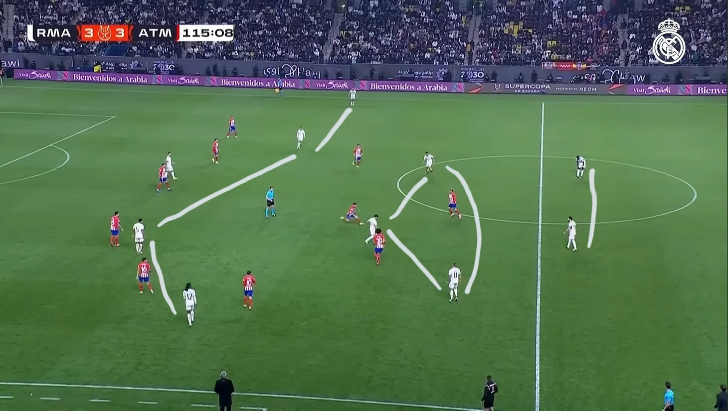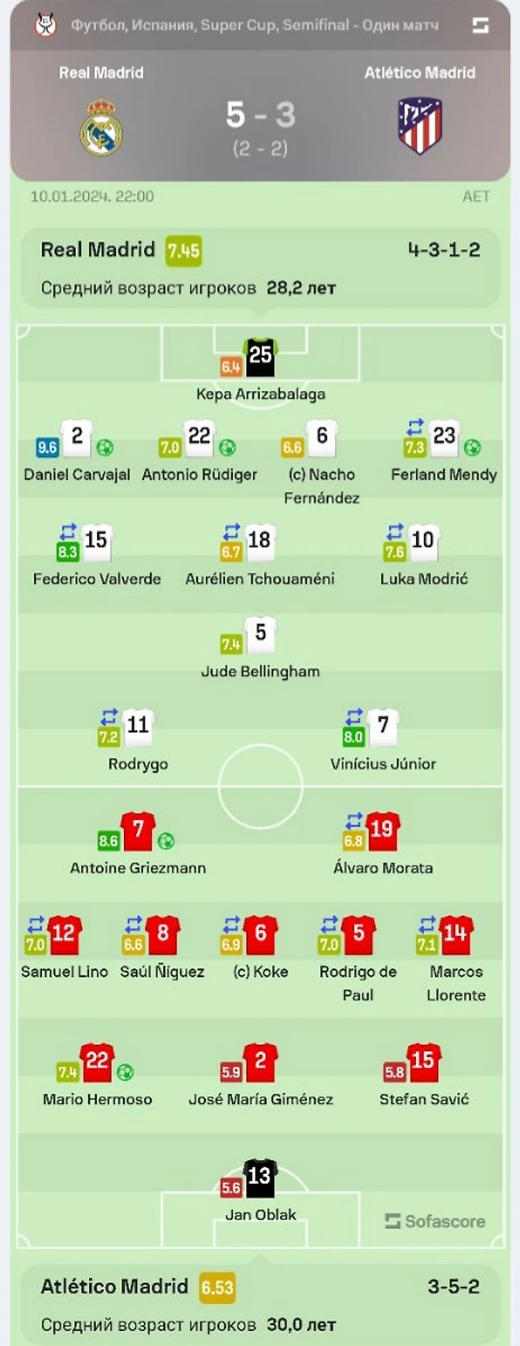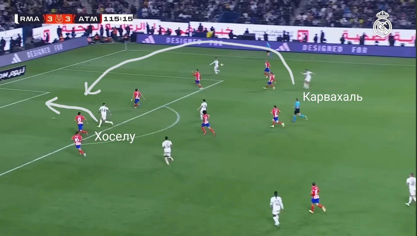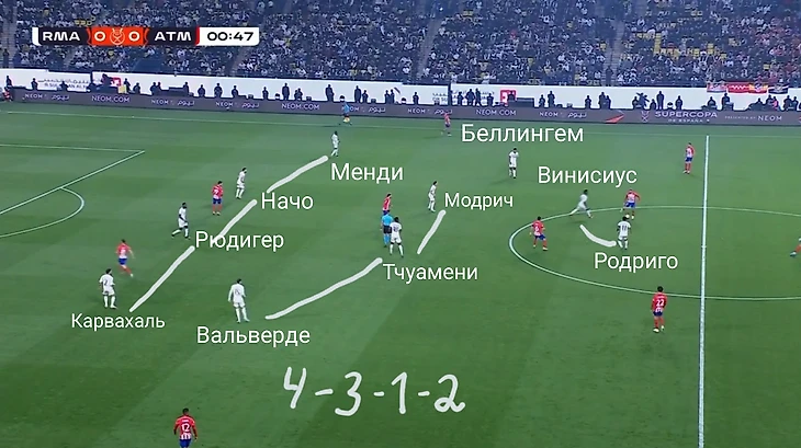 Карло Анчелотти учёл все предыдущие ошибки матча с «Атлетико» в Ла Лиге. Дело в том, что в сентябрьском дерби «Реал» использовал схему 4-3-2-1( ёлочку) и у «Атлетико» был один и тот же ход для вскрытия обороны «Мадрида». Навесы на Морату были очень эффективны. В Суперкубке «Реал Мадрид» использовал в обороне схему 4-4-2. Вальверде и Беллингем закрывали фланги, поэтому в этом матче «Реал» был намного устойчивей чем в дерби.