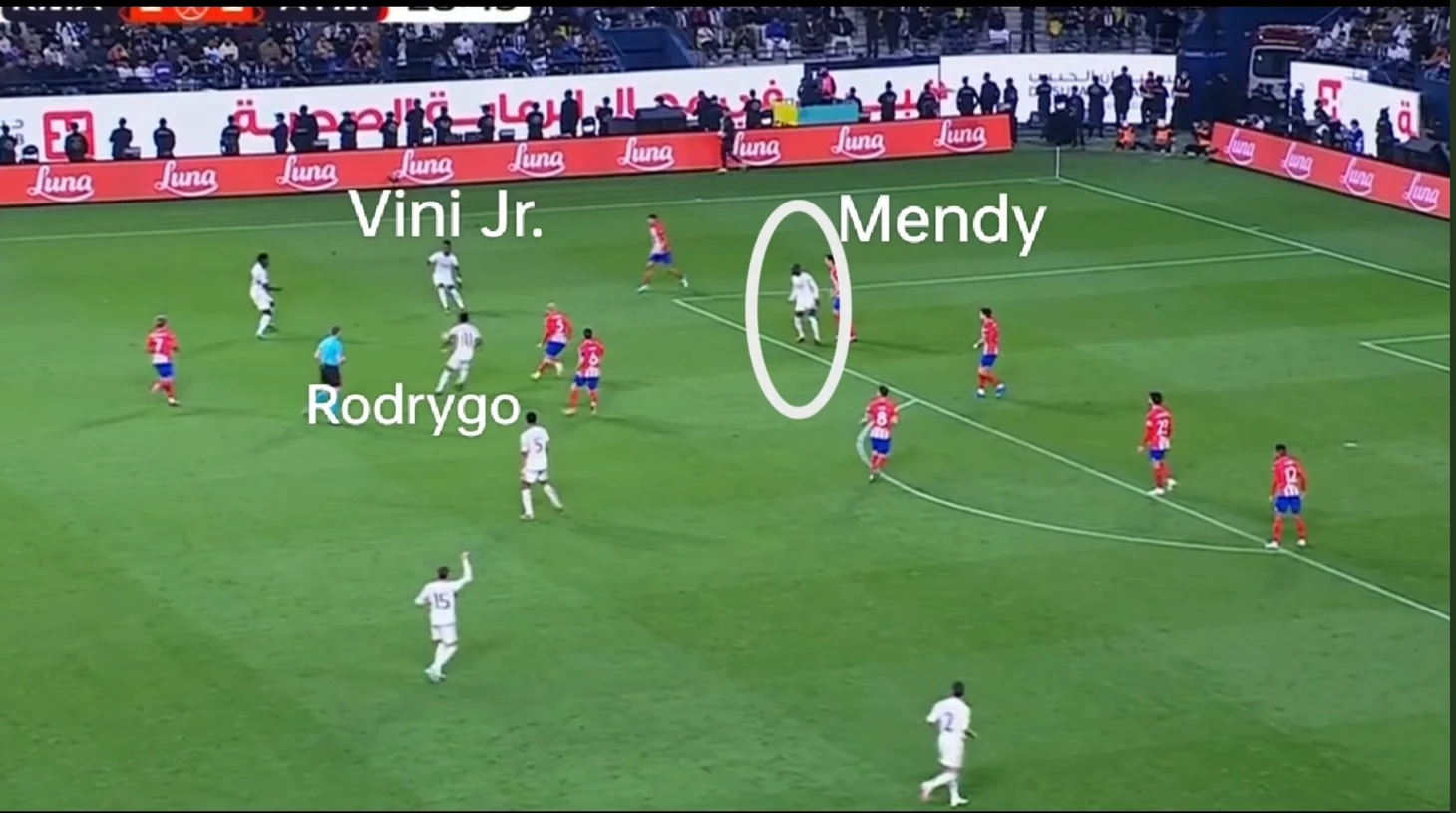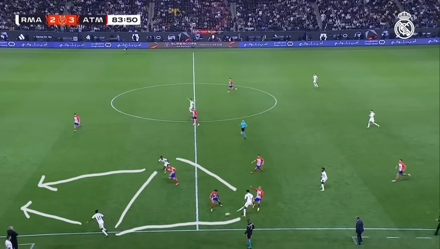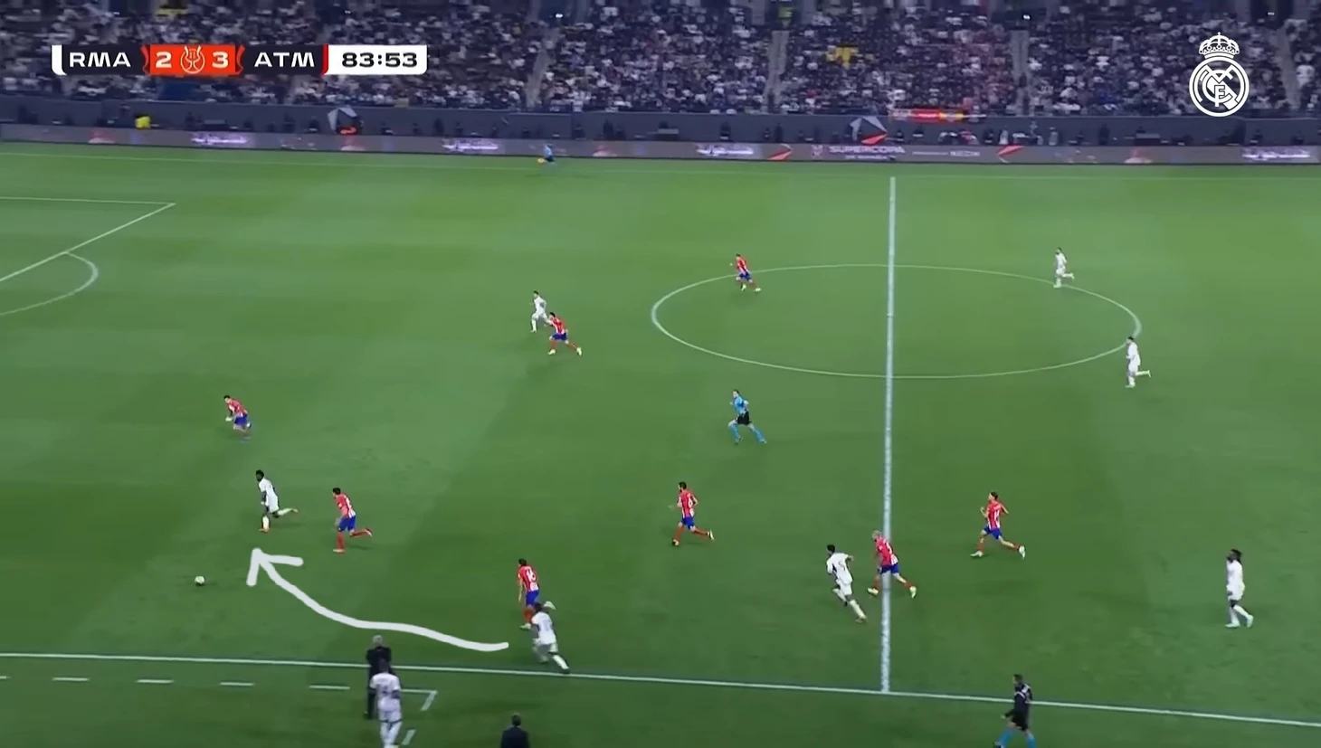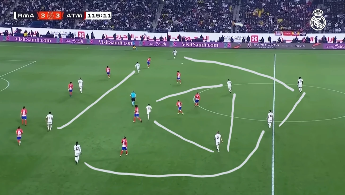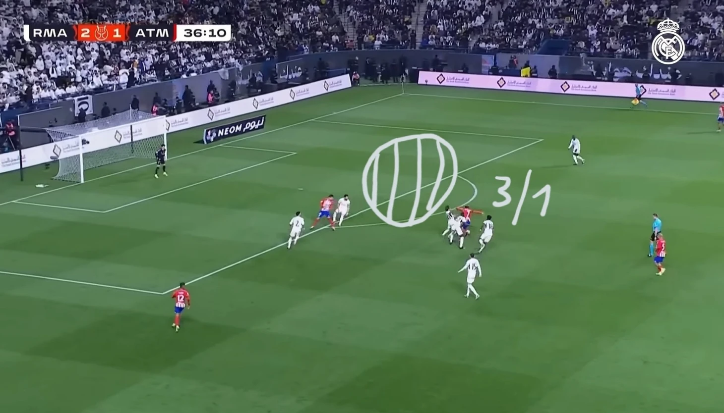 Карло Анчелотти учёл все предыдущие ошибки матча с «Атлетико» в Ла Лиге. Дело в том, что в сентябрьском дерби «Реал» использовал схему 4-3-2-1( ёлочку) и у «Атлетико» был один и тот же ход для вскрытия обороны «Мадрида». Навесы на Морату были очень эффективны. В Суперкубке «Реал Мадрид» использовал в обороне схему 4-4-2. Вальверде и Беллингем закрывали фланги, поэтому в этом матче «Реал» был намного устойчивей чем в дерби.