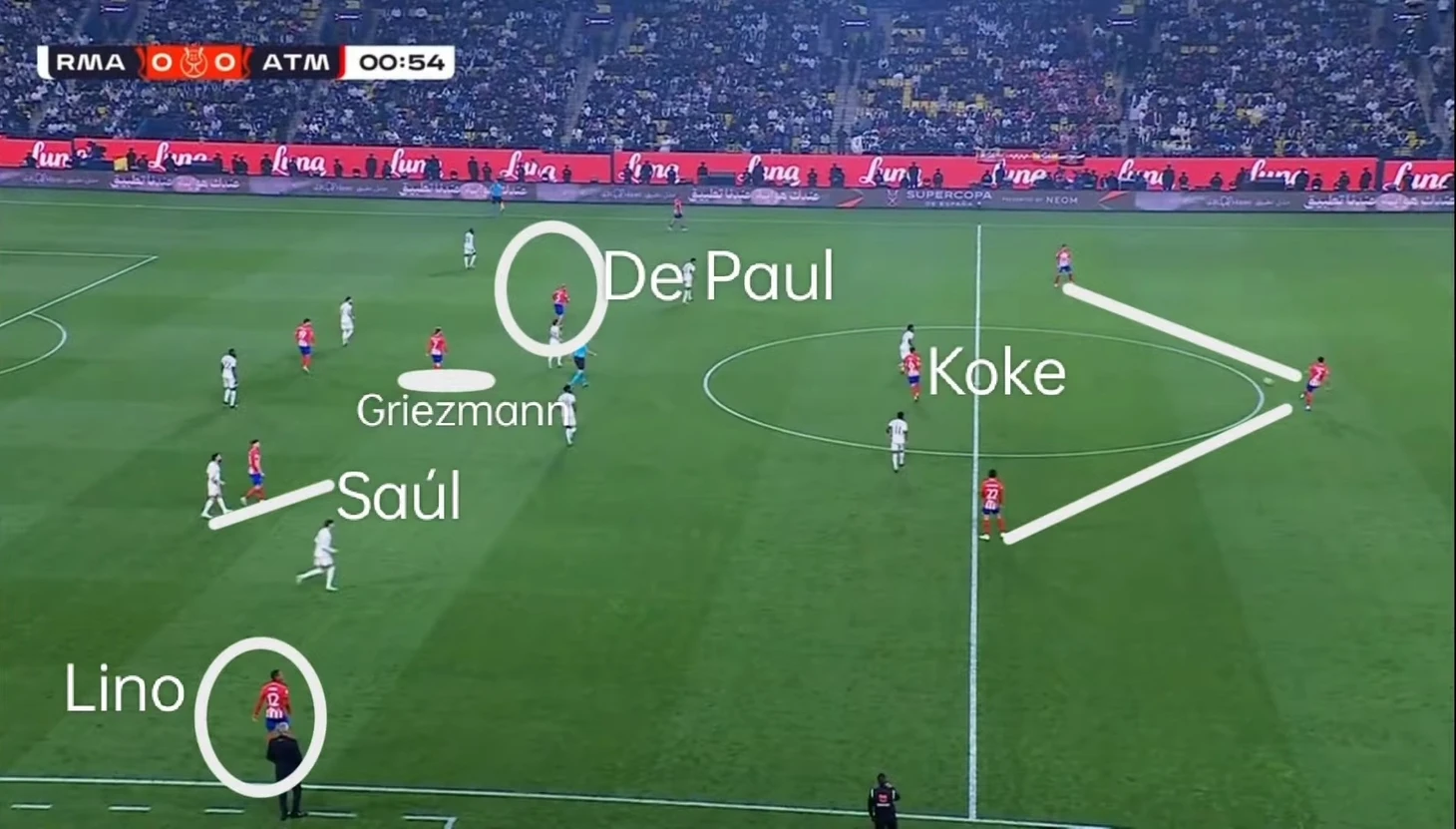 У «Атлетико» был ещё один ход для вскрытия обороны «Мадрида». Гризманн опускался глубже, даже в опорную зону, а Сауль занимал место место нападающего. По ходу первого тайма было заметно, что «Реал» с трудом справляется, но Карло Анчелотти адаптировался и к этому.