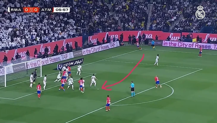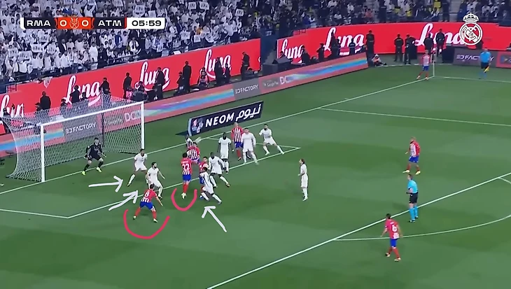 Второй гол «Атлетико» стал результатом индивидуальных ошибок игроков «Мадрида». Тчуамени действовал инертно по отношению к Гризманну, поэтому Рюдигер покинул позицию и кинулся на помощь Тчуамени. Также и Модрич. В результате никто из них не навязал борьбу Гризманну. И он побежал дальше. Могло показаться, что в данной ситуации ошибся Начо, но он закрывал Морату, которого оставил Рюдигер.