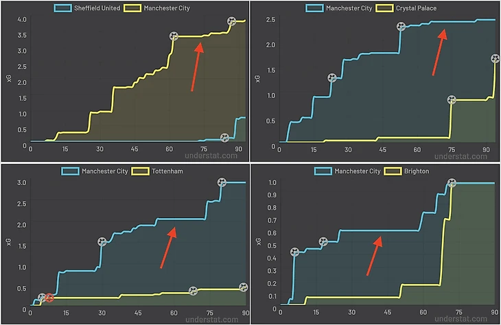 Для наглядности – динамика ожидаемых голов в конкретных матчах. Стрелкой выделен отрезок, когда «Сити» успокоился, поведя в счете или сделав задел. На нем команда совсем перестает атаковать, а соперник наоборот пытается вернуться в игру, а кое-где даже возвращается. Показательно, что такое встречалось у «Сити даже в тех матчах, которые завершались победами. В большинстве игр все равно нарабатывали на победу, но соперник сурово наказывал за отрезки потери концентрации.