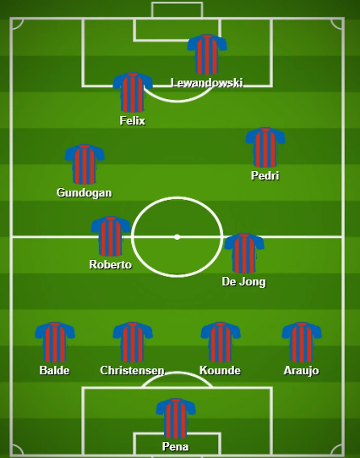 Потенциальный состав «Барселоны» на матч с «Реалом»: Пенья, Араухо, Кунде, Кристенсен, Бальде, Де Йонг, Роберто, Гюндоган, Педри, Феликс, Левандовски.