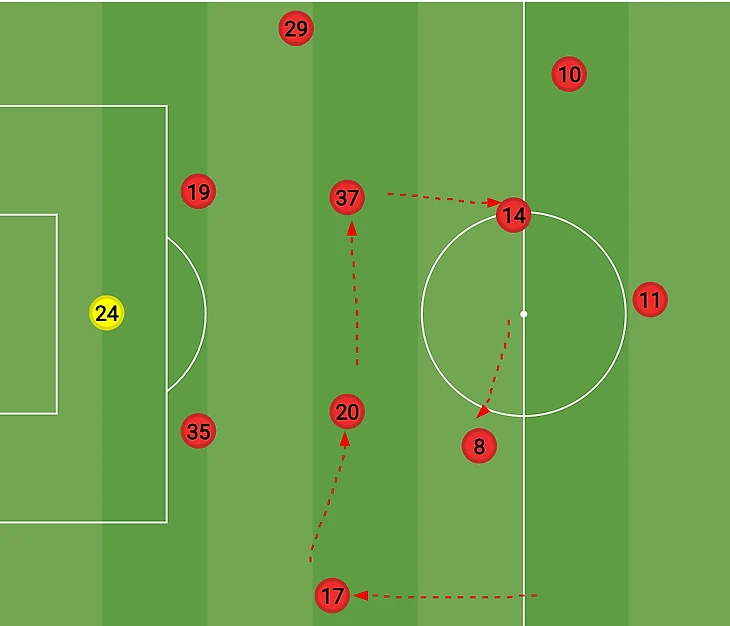 Не сказать, что гол на 3-й минуте что-то поменял, я думаю, что игра и без этого гола носила похожий характер, что и при счете 1-0. Понятно, что Тоттенхэм полетел прессинговаться, это очевидный факт, вопрос был в том, что будет с этим делать МЮ. И вот какую особенность я заметил при начале-развитии атаке у МЮ. Далот, который, как мы выяснили, играл справа заходил в центр в зону, которую освобождали ему полузащитники «дьяволов». Эриксен поднимался ближе к Бруно, который сваливался больше в правый фланг, а Майну двигался левее от центра. Вот все движения на картинке.
