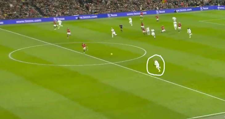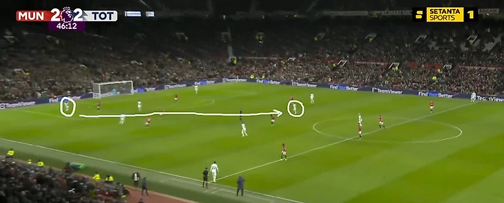Далее Тоттенхэм уже освоился полностью, взял мяч под контроль и пытался строить игру против обороны Юнайтед, которая была представлена блоком 4-4-2, где Фернандес играл второго нападающего. Идея гостей заключалась в том, чтобы вскрыть фланг засчет подключавшихся Порро и Удогие, но тут отдам должное защитникам МЮ. Ван-Биссака всегда славился крутым отбором, а вот Далот очень удивил, перекусил Вернера и сделал много хороших отборов. Вот кстати плавно мы и подошли к фигуре недавно перешедшего в стан «шпор» Тимо Вернера. Он вышел в старте, как я уже писал. Играл на знакомой ему позиции слева, в Лейпциге тоже частенько он там появлялся. Сказать, что он выдал какой-то перфоманс? Да нет, не думаю. Вполне средний дебют, который наталкивает на мысль, что Тимо нужно адаптироваться под требования австралийского тренера. В первом тайме немец пару раз пытался взять игру на себя и ударить, но удары шли, мягко сказать, «в молоко». После этого новичок ТТХ больше отыгрывался назад, нежели обострял. Но был момент, который полностью отражает сильные стороны Вернера. Вот смотрите на картинку.