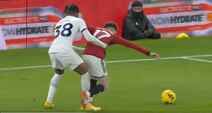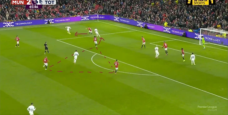 Вернер получает мяч, Далот его встречает, тут особо вопросов нет. Самая главная претензия к тройке в середине поля. Бентанкур находится между 3-мя игроками МЮ, не двумя, не одним, а тремя, в треугольнике (красный пунктир). И никто из этой троицы не среагировал на движение Бентанкура, который в итоге спокойно убрал Эванса и забил «между ушей» Онане. Если Майну я еще могу оправдать, что он двигался за вторым опорником «шпор», который делал внутреннее забегание, то что делали Эриксен и Бруно, я не могу понять.